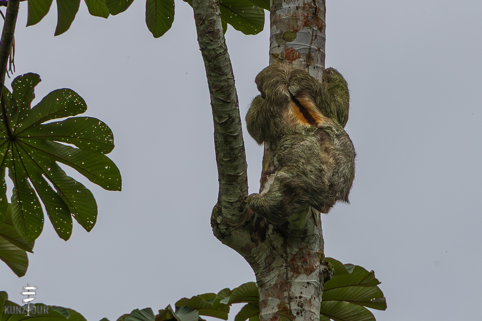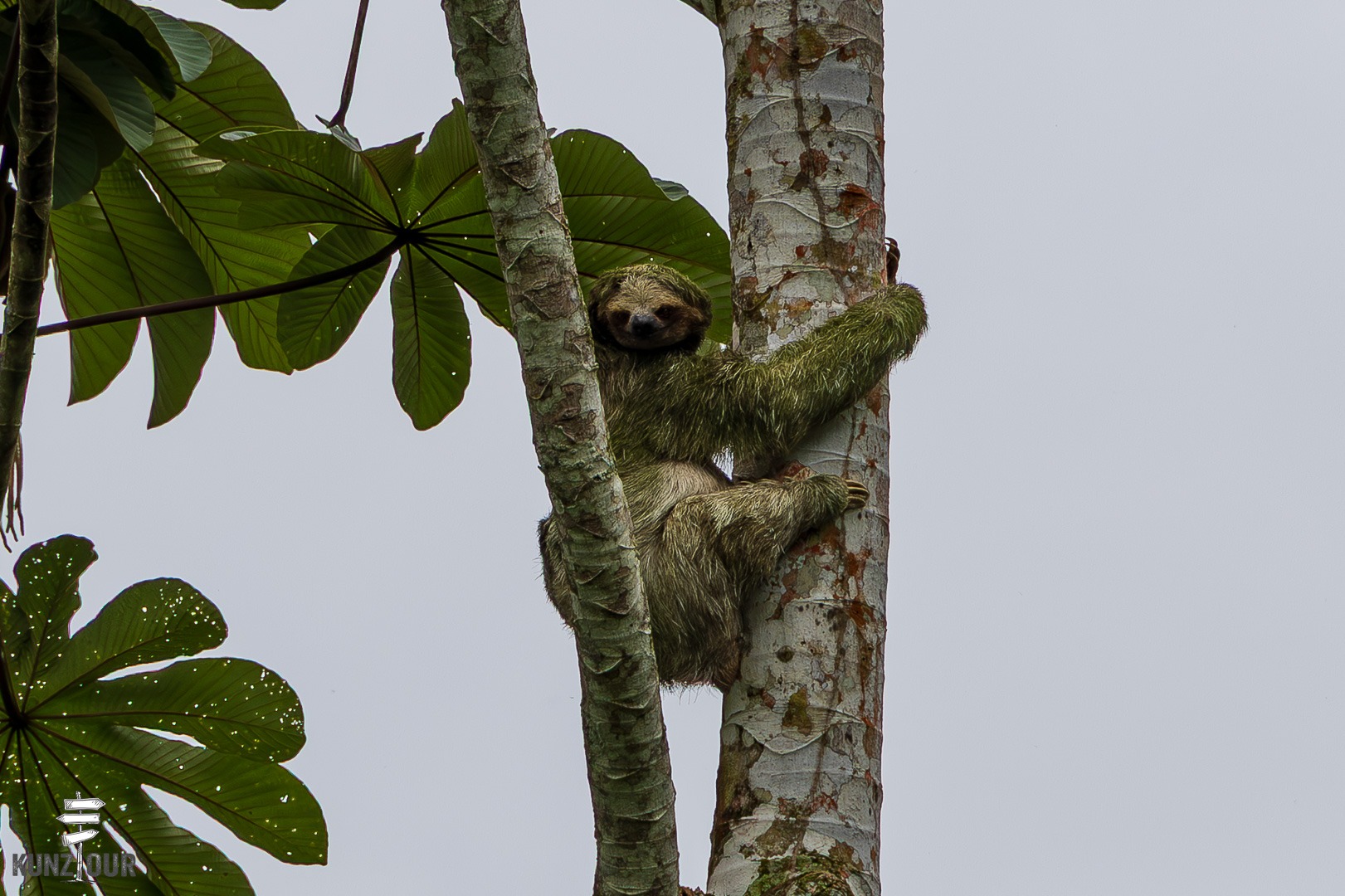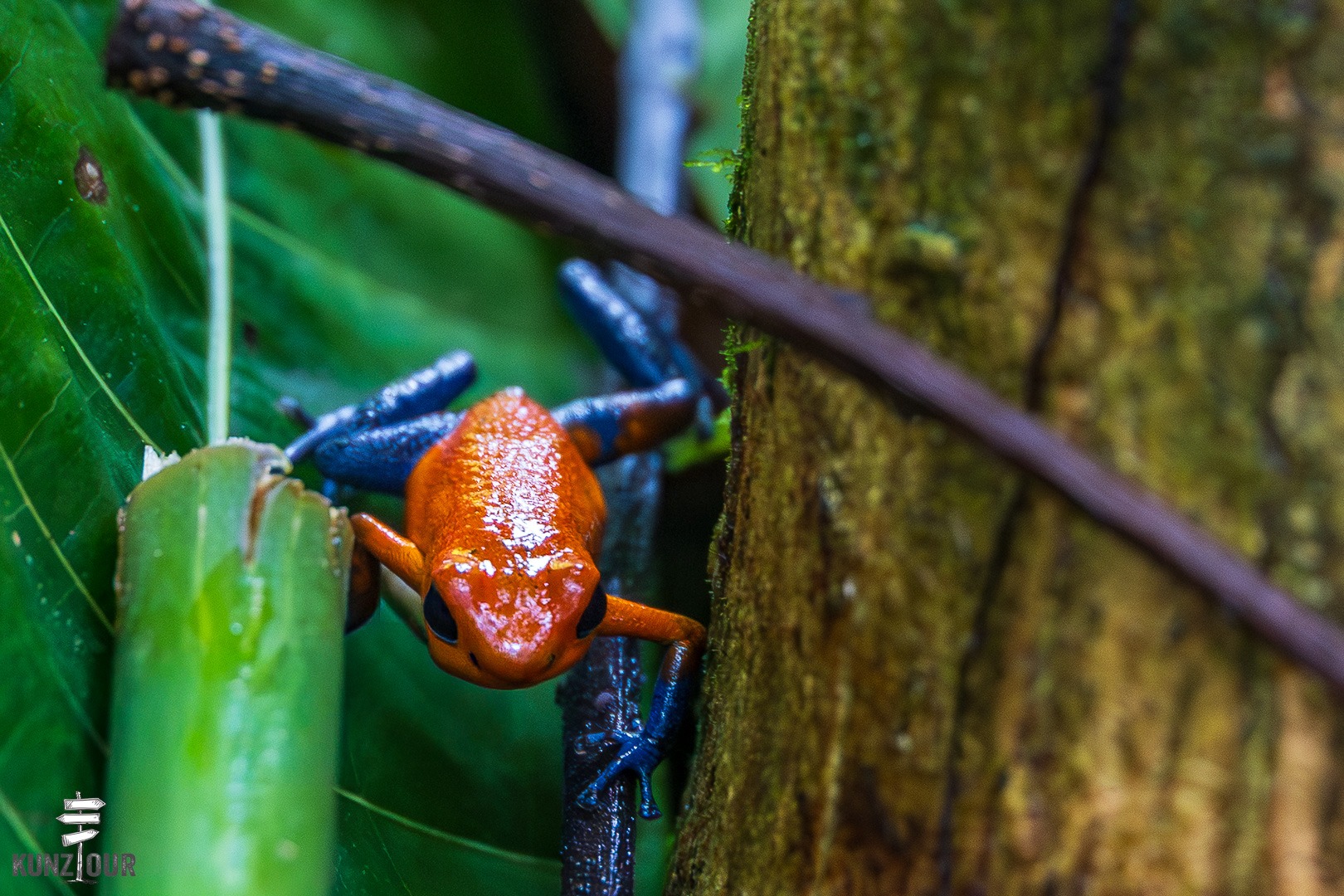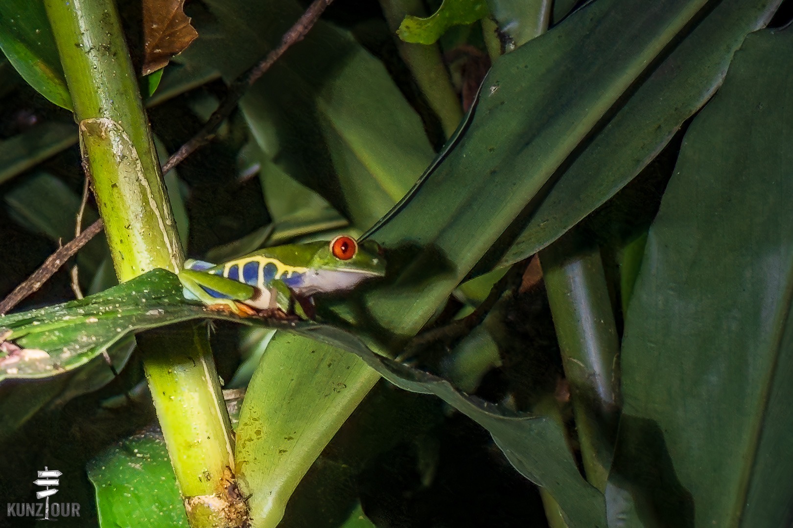 Wir durften bei ihm im Zelt übernachten und erhielten am nächsten Morgen eine sehr informative Privattour durch das Gelände, bei der wir viel über die Tier- und Pflanzenwelt erfuhren. Dabei sahen wir eine Vielzahl unterschiedlichster Vögel, sieben Faultiere (Zwei- und Dreifinger) und endlich zwei weitere Arten der einzigartig farbenfrohen und winzigen Frösche – den Rotaugen- und den Bluejeans-Pfeilgift-Frosch.